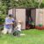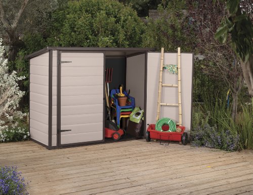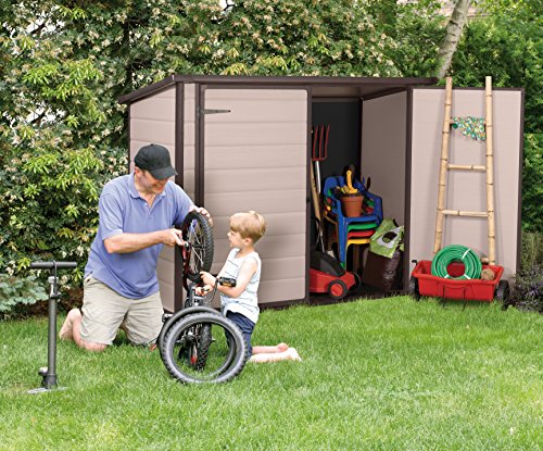 Zum Verstauen der Mülltonnen, Fahrräder oder Gartengeräte lassen sich die beiden Türen sehr weit öffnen. So lässt sich alles sehr einfach verstauen. Mit einem Vorhänge- oder Bügelschloss kann man die Gerätebox auch leicht sichern.