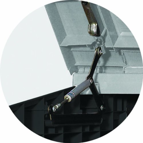 Der Deckel lässt sich durch die Gasdruckfedern leicht hochklappen. Außerdem hat sie auch einen intergrierten Mülltonnen-Deckelöffner, der mit einer Kette funktioniert. Zum Verstauen der Gartengeräte lassen sich die beiden Türen sehr weit öffnen. So lassen sich der Grill, der Rasenmäher oder die Gartenmöbel sehr einfach verstauen. Mit einem Vorhänge- oder Bügelschloss lässt sich die Gerätebox auch leicht absichern.