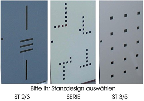 Die Müllbox ist sehr stabil verarbeitet mit einem verzinktem Stahlrahmen und verzinkte Bleche für die Verkleidung. Die Pfosten sind zum genauen Ausrichten bis zu 20 mm höhenverstellbar. Der Deckel ist mit einer Kette ausgestattet, damit beim Öffnen der Müllbox gleichzeitig auch die Mülltonne geöffnet wird. Bei den Türen haben Sie ohne Mehrpreis die Wahl zwischen 3 verschiedenen Stanzdesigns.