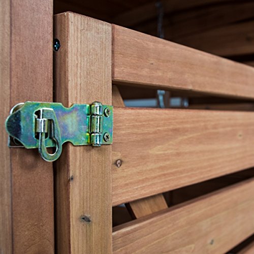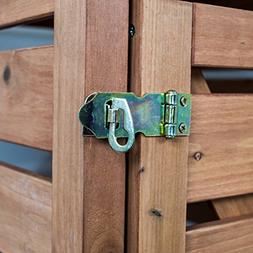 Der Deckel der Mülltonnen-Boxen wird mittels einer mitgelieferten Kette am Mülltonnen-Deckel befestigt, so dass Sie mit einem Griff beides öffnen können. Für zusätzliche Erleichterung beim Handling sind zum nachträglichen Einbau Scharniere oder Stoßdämpfer für den Deckel zu empfehlen.